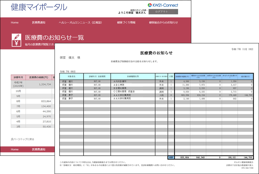 そこで、健康保険組合では、いつでも医療費を確認できるよう、加入者専用Webサイト「健康マイポータル」に、みなさんが受診された医療費のお知らせを掲載しています。